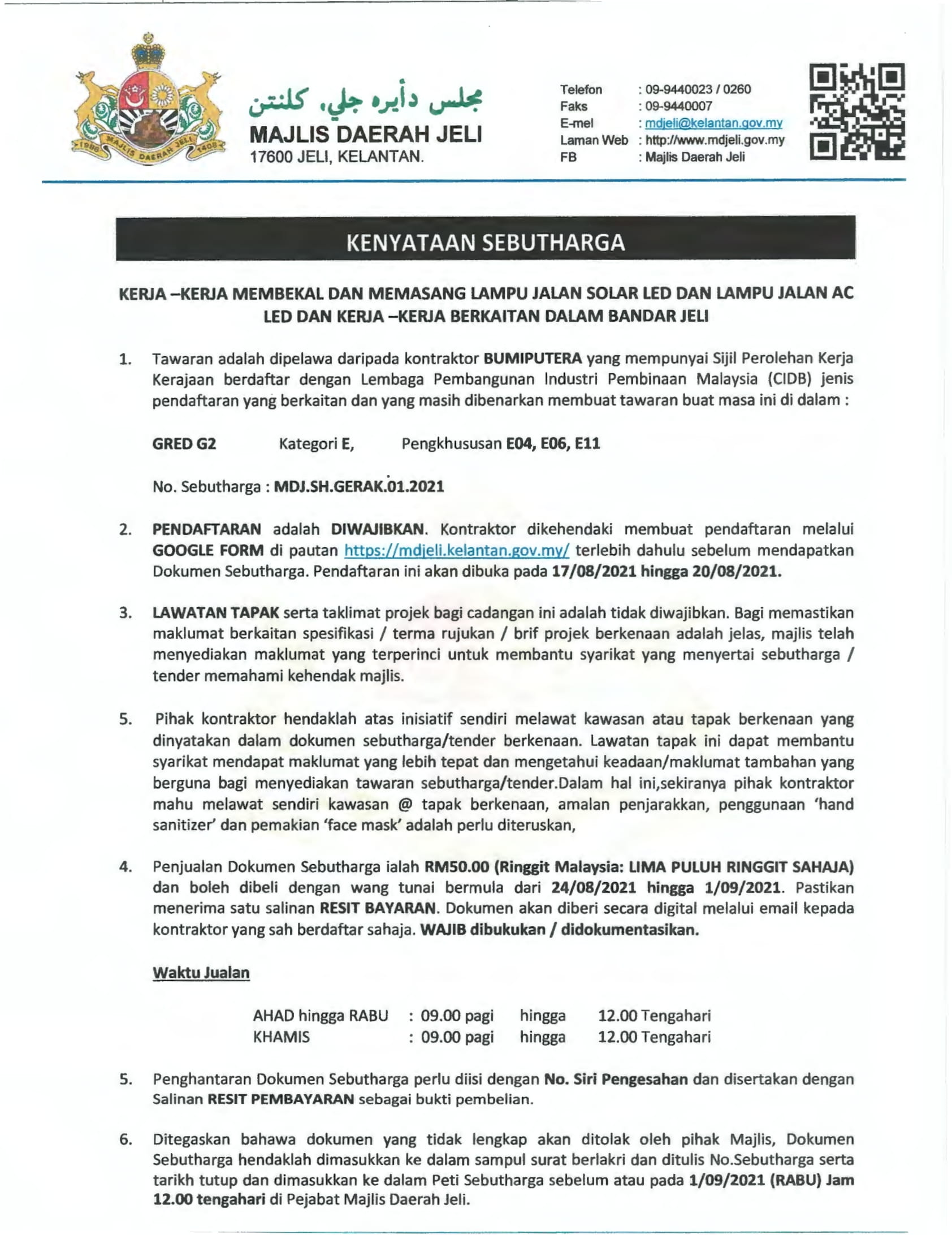 No. Sebutharga : ๐ ๐๐.๐ฆ๐.๐๐๐ฅ๐๐.๐ฌ๐ญ.๐ฎ๐ฌ๐ฎ๐ญ ) KERJA -KERJA MEMBEKAL DAN MEMASANG LAMPU JALAN SOLAR LED DAN LAMPU JALAN AC LED DAN KERJA -KERJA BERKAITAN DALAM BANDAR JELI